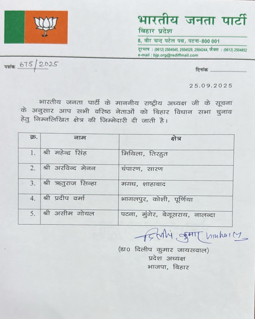 Bihar BJP: बिहार विधानसभा चुनाव 2025 की तैयारियों के बीच भारतीय जनता पार्टी (BJP) ने अपनी संगठनात्मक रणनीति को अंतिम रूप देना शुरू कर दिया है. बिहार बीजेपी अध्यक्ष डॉ. दिलीप कुमार जायसवाल ने एक पत्र जारी किया. इसमें पार्टी के राष्ट्रीय अध्यक्ष जेपी नड्डा के निर्देश पर 5 नेताओं को अलग-अलग क्षेत्रों की जिम्मेदारी सौंपी गई है.