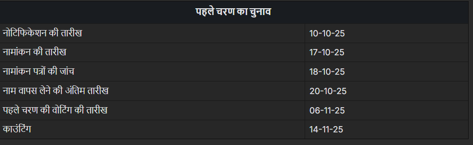 चुनावों की घोषणा के साथ ही बिहार में आदर्श आचार संहिता लागू हो गई है. जेडीयू ने राज्य में एक चरण में चुनाव कराने की मांग की थी. हालांकि, चुनाव आयोग ने इस बार राज्य में दो चरणों में चुनाव करने का ऐलान किया है. पहले चरण में कुल 121 सीटों पर वोटिंग होगी वहीं, दूसरे चरण में 122 सीटों पर वोट डाले जाएंगे.