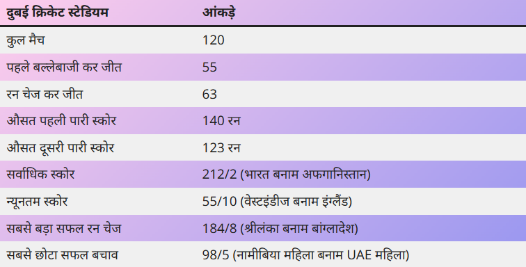 इस मैदान पर अब तक खेले गए टी20 आई के आंकड़े देखें तो यहां अब तक कुल 120 टी20 मुकाबले खेले गए हैं, जिनमें 55 मुकाबले पहले बल्लेबाजी करने वाली टीम ने जीते हैं. 63 बार टीमों ने रन चेज करते हुए इस मैदान पर जीत दर्ज की है. इसका मतलब है कि यहां रन चेज करने वाली टीम का जीत प्रतिशत ज्यादा है, इससे पता चलता है कि इस मैदान पर रन चेज करना आसान है. दुबई के मैदान पर पहली पारी का औसत स्कोर 140 है, जबकि दूसरी पारी का औसत स्कोर 123 है.