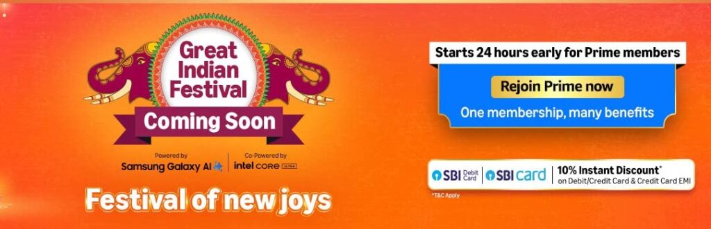 अमेज़न ग्रेट इंडियन फेस्टिवल सेल 2025 में एसबीआई डेबिट और क्रेडिट कार्ड लेनदेन पर 10 प्रतिशत तक की छूट मिलेगी।