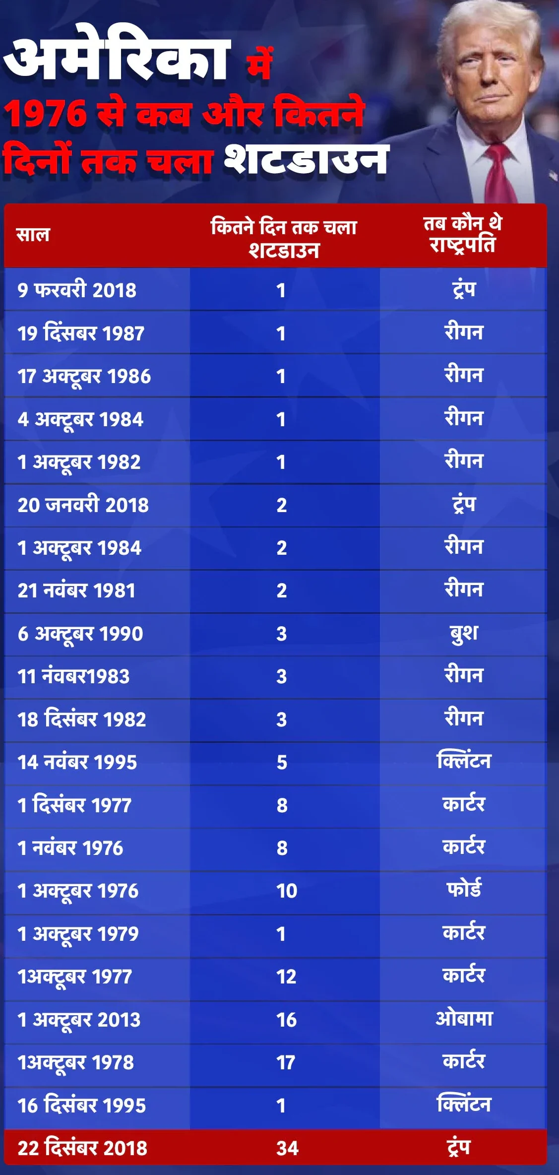 दरअसल अमेरिका में 1 अक्तूबर से नया वित्त वर्ष लागू होता है. लेकि इस बार ट्रंप सरकार का स्पेंडिंग बिल पास नहीं हुआ है और रात 12.01 बजे शटडाउन शुरू हो गया. इस बार कुल सरकारी कर्मचारियों में से 40 फीसदी यानी लगभग 8 लाख कर्मियों को बिना वेतन टेंपरेरी लीव पर भेजा जा सकता है. हालांकि कानून व्यवस्था, सीमा सुरक्षा, मेडिकल और हवाई सेवाओं जैसी जरूरी सेवाएं जारी रहेंगी. फूड सहायता प्रोग्राम, खान-पाने के निरीक्षण, केंद्र संचालित स्कूल, स्टूडेंट लोन जैसी सेवाओं को भी सीमित या बंद किया जा सकता है.